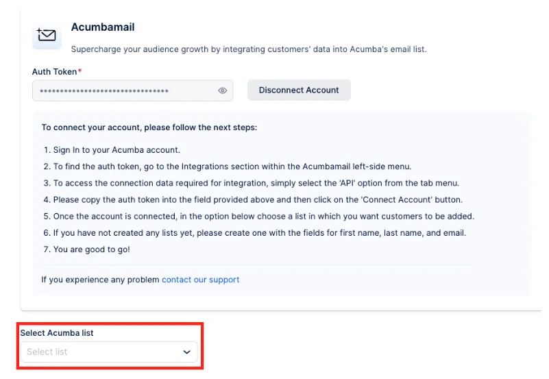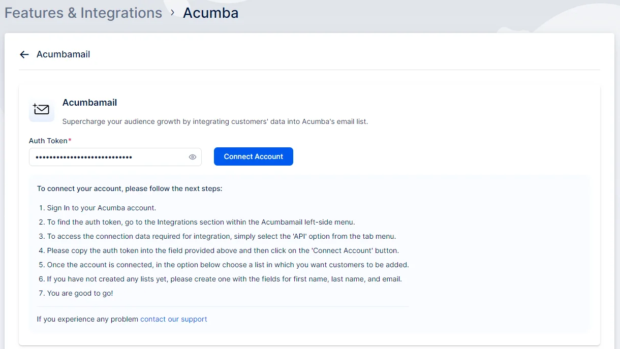 Next, a new page will open with instructions on how to link your Acumbamail account. You’ll need to add the Acumbamail auth token and click “Connect Account” to initiate the setup process.