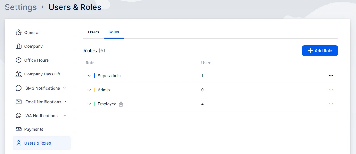In Quickly Booked App , you can assign predefined roles such as Employee, Admin, or Superadmin to your users. These roles come with default permissions. Alternatively, you can create custom roles with specific permissions tailored to your needs. Custom roles allow you to control the level of access and management for each user by specifying which Quickly Booked App entities they can view, manage, or delete.