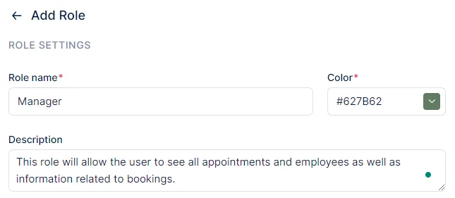 Upon clicking the “+ Add Role” button, you will be prompted to enter the name of your role, select a color, and provide a description. The description will be displayed on the Roles list, allowing you to have a brief summary of each role for easy reference.