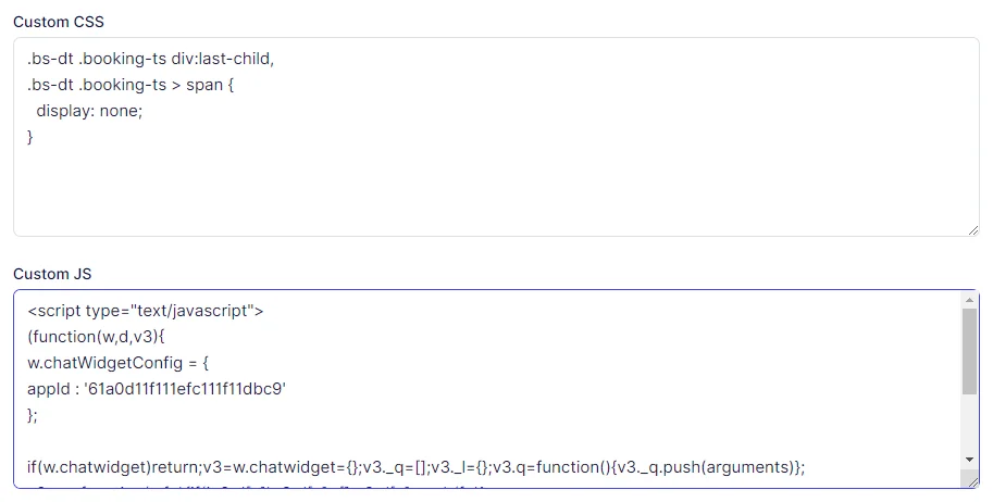 Within this section, users have the ability to insert their personalized CSS or JavaScript code directly into their booking website.