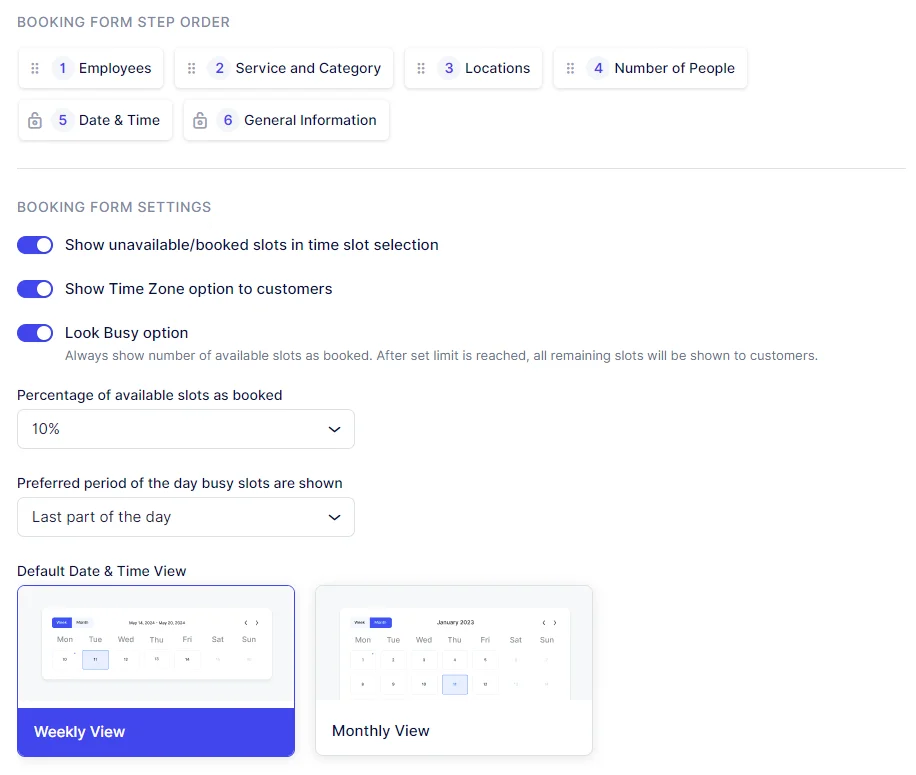 The “General” subcategory of Booking Form Steps settings offers flexibility in organizing the steps within the booking form and customizing display options. This includes the ability to show unavailable time slots, adjust the time zone display, and activate the “Look Busy” feature.
