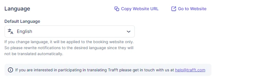 In the Language section, you have the option to translate the booking website and invoices into different languages using the “Languages” dropdown. Currently, the available languages include Arabic, Brazilian Portuguese, Bulgarian, Chinese (Traditional), Chinese (China, Simplified), Chinese (Taiwan, Simplified), Czech, Danish, Dutch, English, Finnish, French, German, Greek, Hebrew, Hungarian, Italian, Japanese, Korean, Malay, Norwegian, Polish, Portuguese, Romanian, Russian, Serbian, Slovak, Slovenian, Spanish, Swedish, Ukrainian, and Vietnamese.