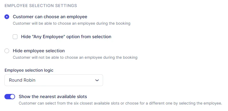 In the Employee Selection Settings, you can decide whether you want to provide clients with the option to choose an employee for their appointment. You can also establish the logic for selecting employees if a customer hasn’t made a specific choice. By enabling the “Customer can choose an employee” option, clients can select a specific employee for their booking or opt for the “Any Employee” choice, which will automatically assign an employee based on the selection logic.