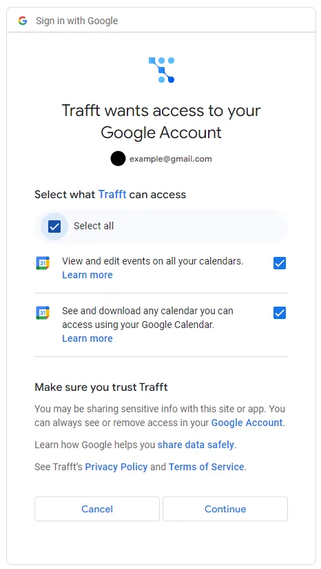 For the Google Calendar integration to work, you need to select both permissions and click on Continue, as shown in the screenshot above.