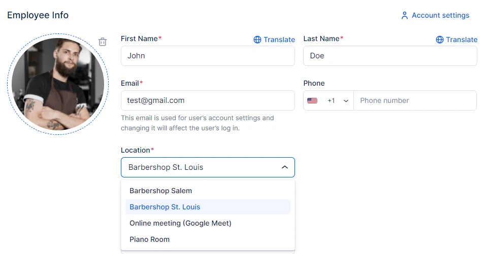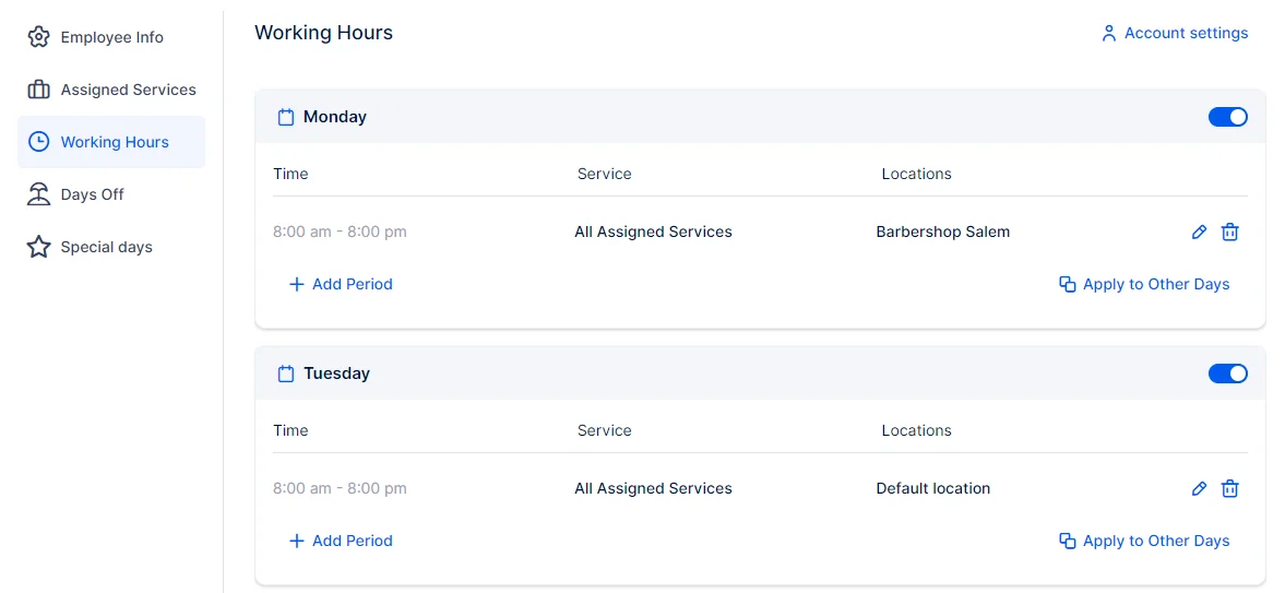 In this case, the employee will cover the Default Location (Google Meet) on Tuesdays, but Monday is configured for the “Barbershop Salem” location. Remember that you can select multiple locations during the employee’s working hours and that you can create multiple working periods so the employee covers different locations per period.