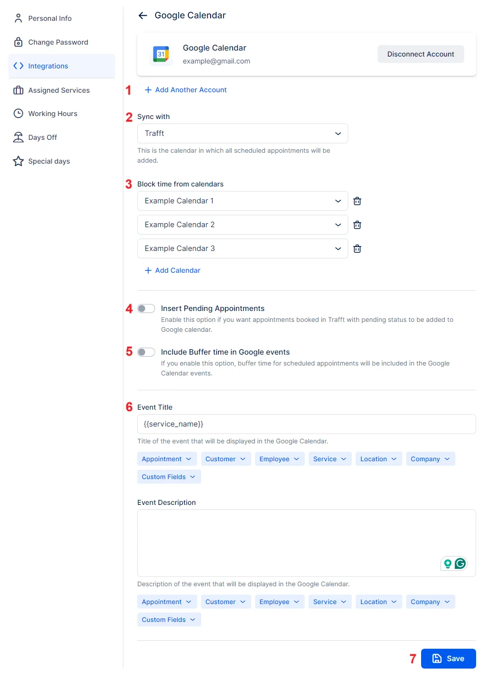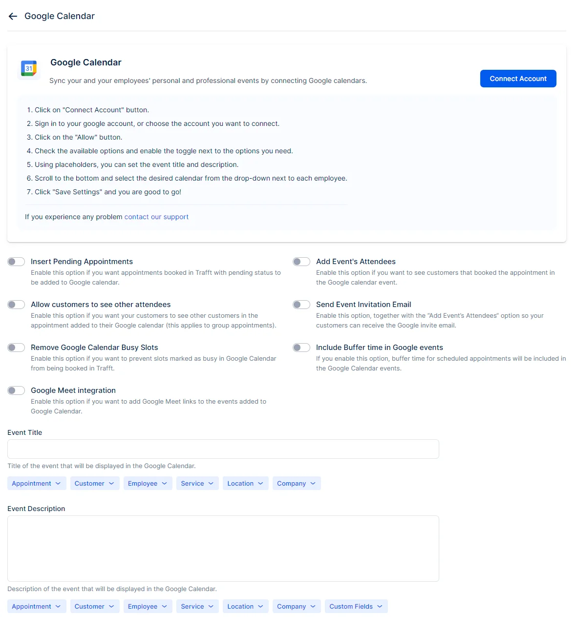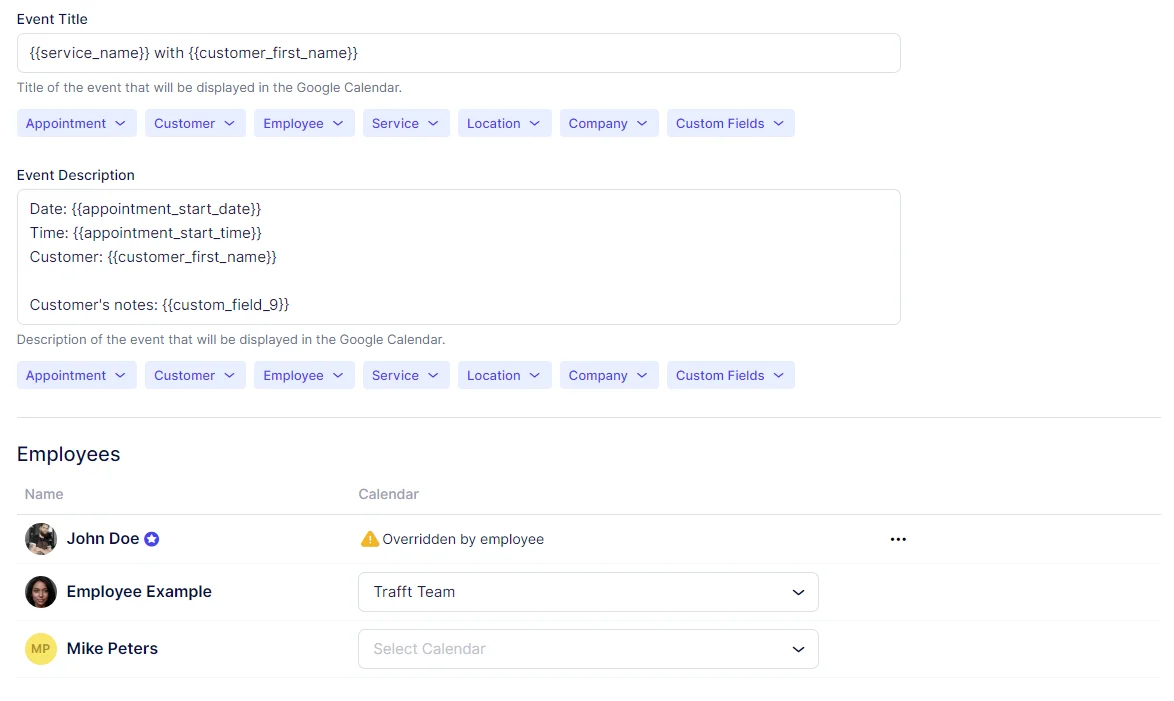 Once you connect the account through the main Google Calendar settings page, all the employees that you created will appear below the Event Title and Event Description section: