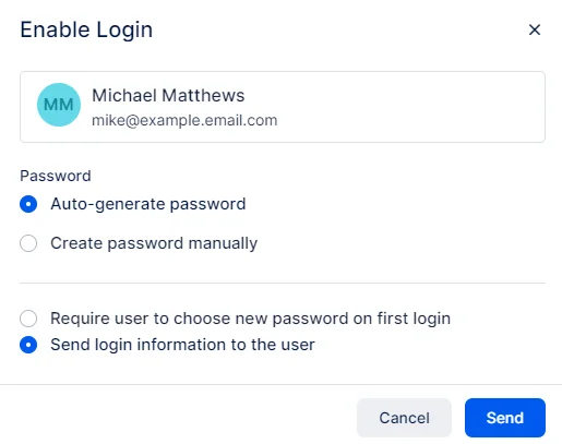 In a new popup that appears, you can choose whether Quickly Booked App will auto-generate a password or if you prefer to create a password manually for this employee. Below that, you can also define whether the employee will be required to choose a new password on the first login or if you’ll only send the login information to the user.