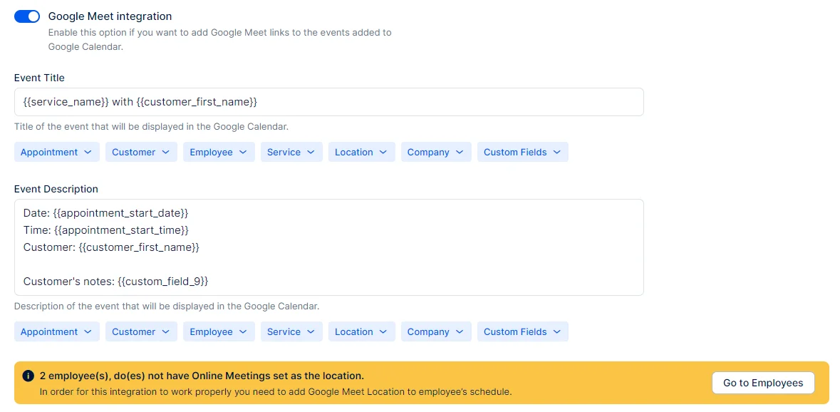 Once enabled, Quickly Booked App may show a yellow warning above the employees list, letting you know that there is a certain number of employees, connected to Google Calendar, but that do not have the Online Meetings set as the location. You can click on the “Go to Employees” button, and Quickly Booked App will take you to the Employees section, which is our next step either way.