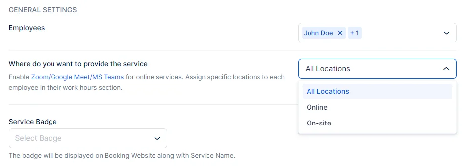 “Online” and “All Locations” will allow the service appointments to be held via Google Meet, while “On-Site” will prevent this from happening.