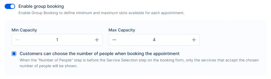 To set up your service as a group booking, adjust the “Min Capacity” and the “Max Capacity“. When you activate the “Customers can choose the number of people when booking the appointment” option, customers will be able to choose the number of individuals they are booking for. If this option is not activated, each customer can only book for themselves.