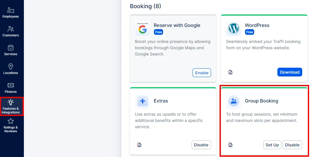 Group bookings are essential for managing classes, seminars, sports activities, and various other group sessions. To enable and accept group bookings, you need to activate our Group Booking custom feature through the Features & Integrations page.
