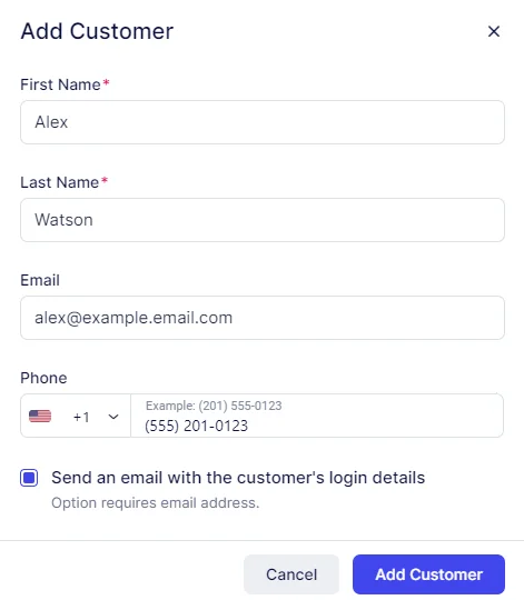 To create your first customer, simply click on the “+ Add Customer” button. This action opens a popup where you can enter the necessary customer details: