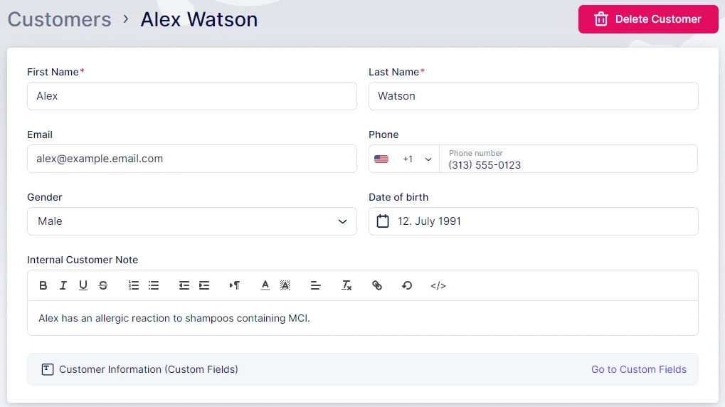 - Customer Notes: This field is for internal purposes and is not visible to the customer. You can add notes such as allergies, behavioral preferences, or any other relevant information for internal use.