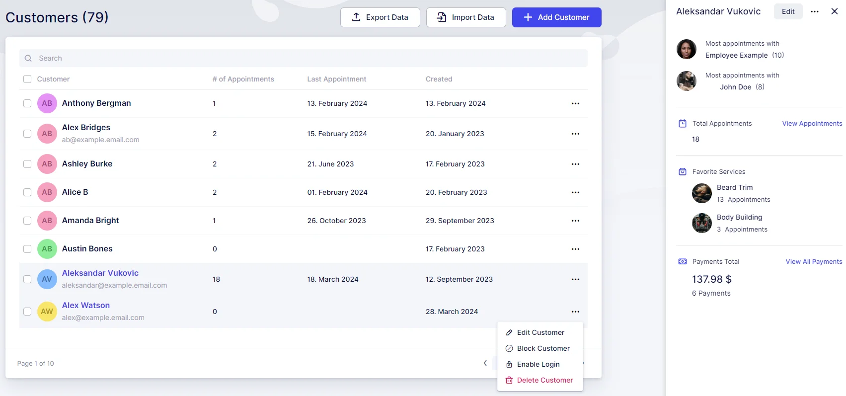 This overview helps you easily identify old customers and those with the most appointments, providing insight into potential loyalty programs.