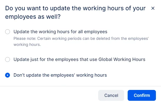 Office Hours settings will be automatically applied to every new employee you create. However, if you have existing employees with modified Working Hours, changing the office hours will present you with three options: