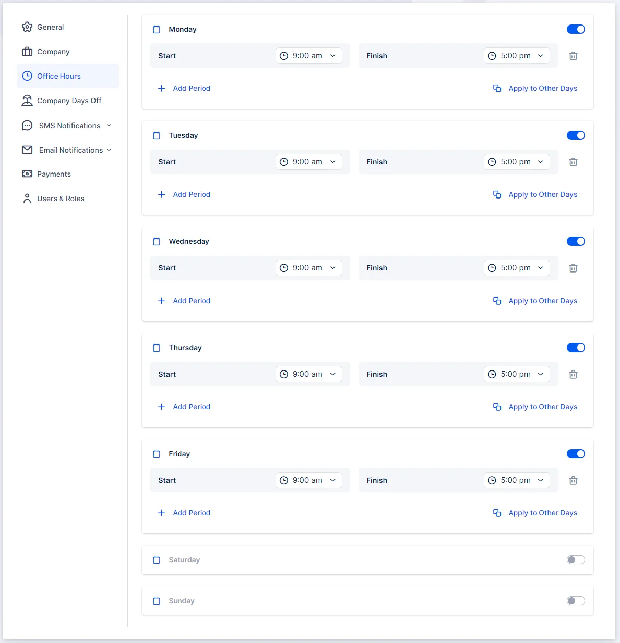 When you access the Settings page of Quickly Booked App (located at the bottom left corner of the Admin section), you can configure your Office Hours. By default, they are set from 09:00 – 17:00, Monday – Friday. However, you have the flexibility to customize them according to your business needs.