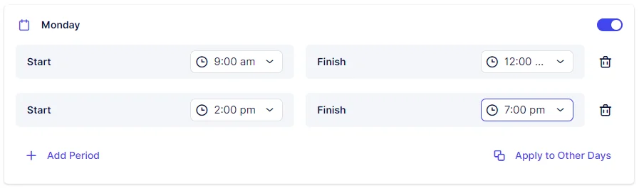 If you intend to include several periods within a day, it’s important to add them in sequential order. For instance, add 08:00 – 10:00 first, followed by 12:00 – 17:00. The order matters because the initial period you add will block time slots preceding it. If you add 12:00 – 17:00 before 08:00 – 10:00, you won’t be able to select the earlier period afterward.