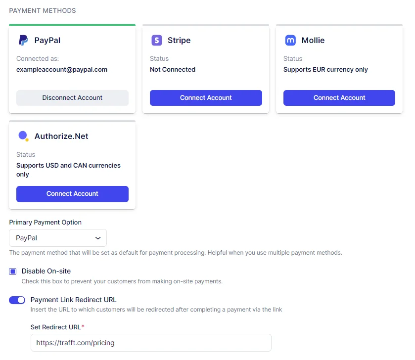 Upon completing the configuration of your payment settings, click on “Save Settings.” Additionally, you can choose your preferred Primary Payment method from the dropdown menu to set it as the default.
