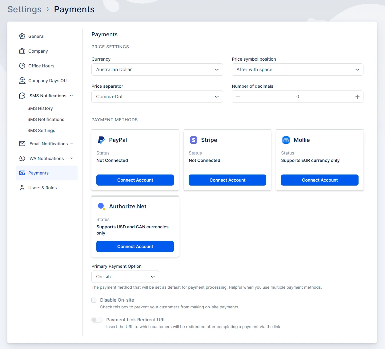 The Payments section in Quickly Booked App’s Settings allows you to configure the currency that’s going to be used, the price separator, the position of the price symbol, and the number of decimals that are going to be used when the price is presented to your customers.