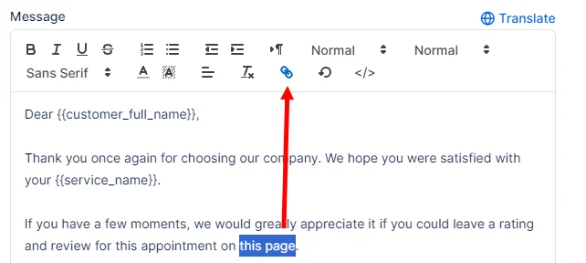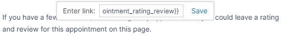 So, select the text that should be hyperlinked and then click on the ‘chain’ icon, as shown in the screenshot above. In the popup that appears, paste the {{appointment_rating_review}} placeholder, like this: