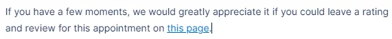 Access Settings/Email Notifications, and add the {{appointment_rating_review}} placeholder as a hyperlink in your email templates. It can’t be used as a placeholder alone, so you’ll need something like this: