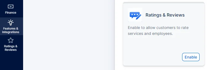 To enable Ratings & Reviews for your account, access the Features & Integrations section, locate (or search for) “Ratings & Reviews” and simply click on the “Enable” button: