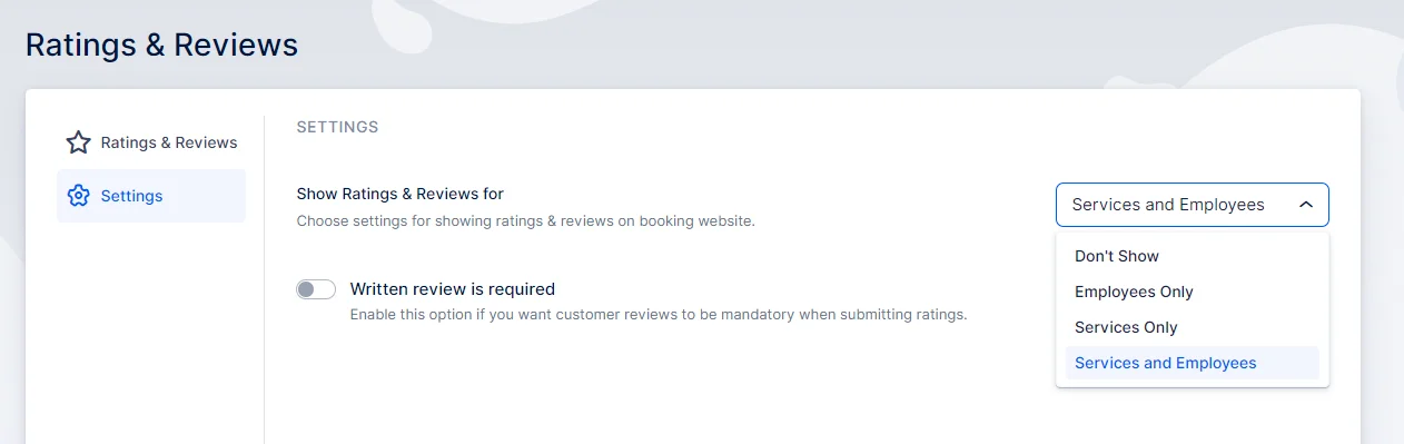 In the Settings tab, you’ll be able to choose whether reviews on your booking website will be shown for both Employees and Services, only Employees, or only Services. You can also choose not to show them on the booking website, so they’re used only for internal purposes.