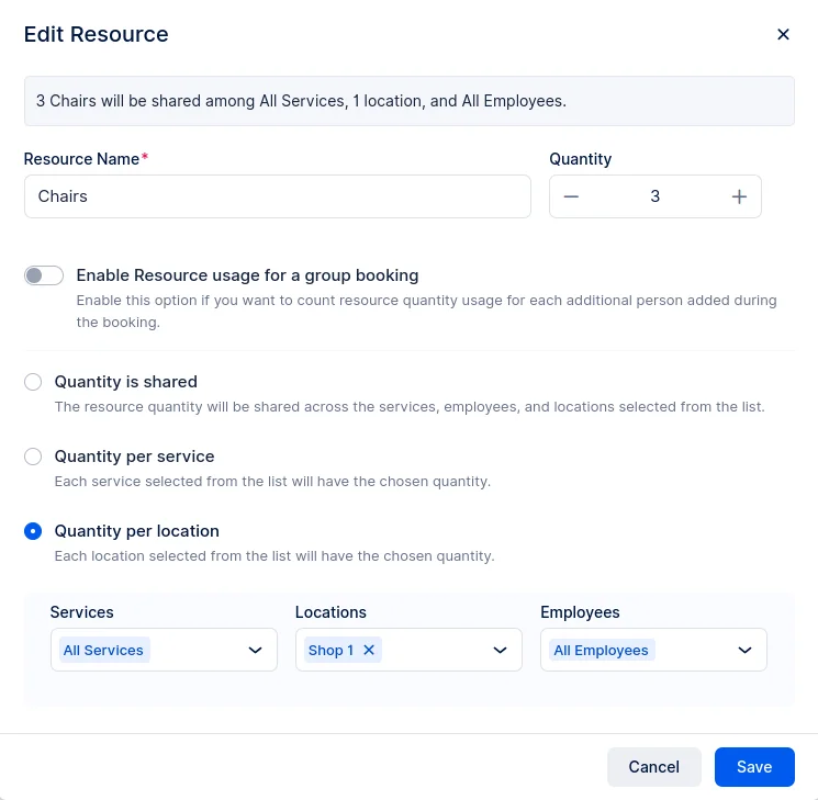 Barbershop Brooklyn: Let’s say “Barbershop Brooklyn” has three chairs (resources) available. If three customers book a slot for the same time, the chairs will be fully occupied. Any further bookings at that time will be blocked, even if other employees are available. This ensures that each customer has a chair reserved, avoiding overbooking the chairs at this location.