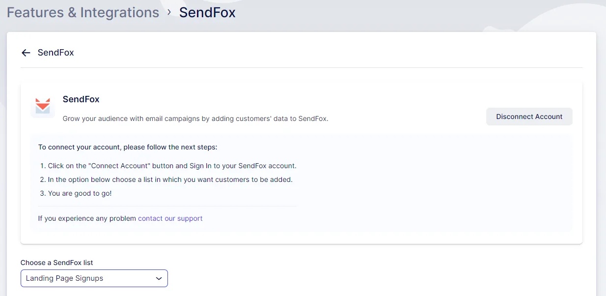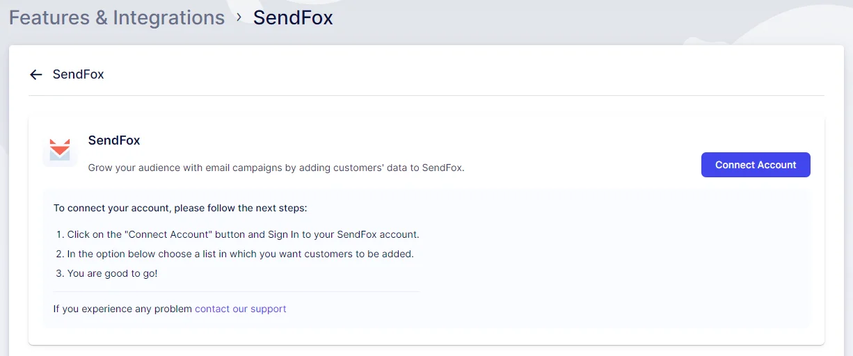 A new page will open with instructions on how to link your SendFox account. Begin by clicking the “Connect Account” button to initiate the setup process.