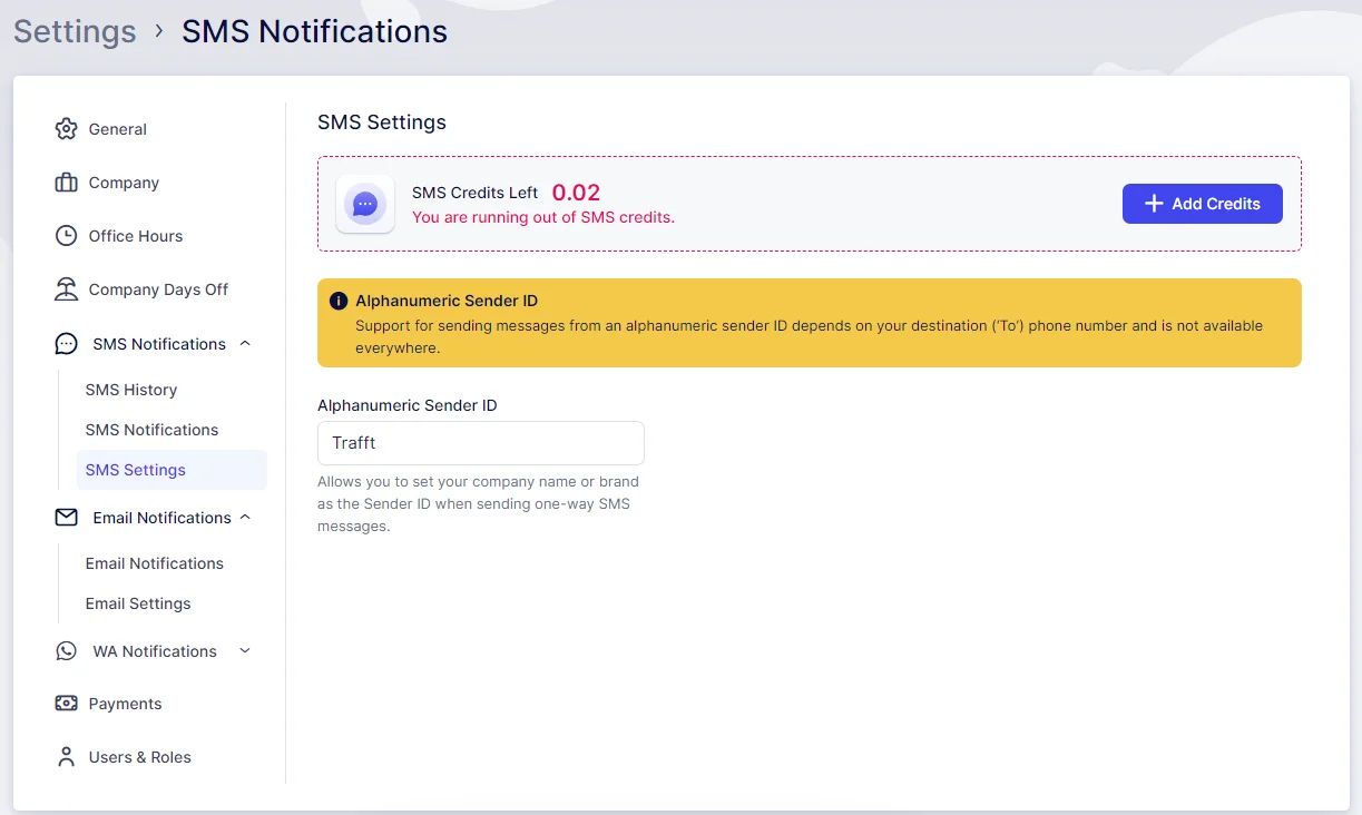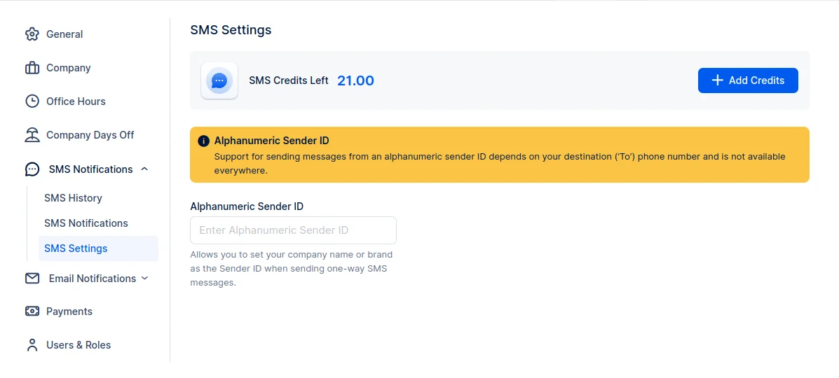 In this section, similar to all preceding sections, you have visibility of your SMS Credit and the option to add New Credit as necessary. Additionally, there’s an opportunity to customize your “Alphanumeric Sender ID” contingent on the destination (‘To’) phone number, though this feature is not available in all countries.