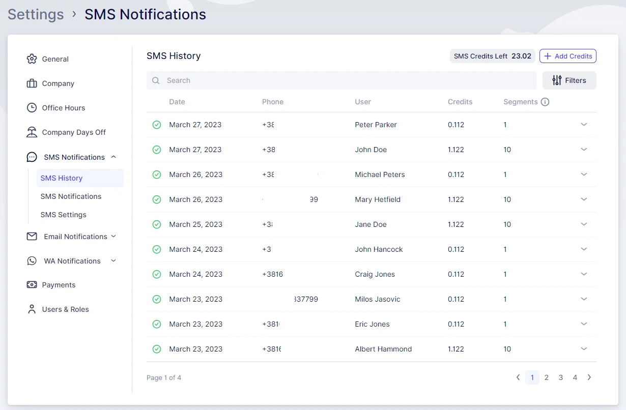 The SMS History tab within Quickly Booked App offers a comprehensive summary of all the messages you’ve sent. It presents the date of each message, the recipient’s name and phone number, the credit utilized for sending the message, and the number of segments into which the message was divided. The segmentation, as mentioned before, is influenced by the quantity and type of characters included in the message. Furthermore, you have the option to view the message content by clicking on the dropdown arrow. As usual, you can filter and search through your message history and check the remaining SMS credits.