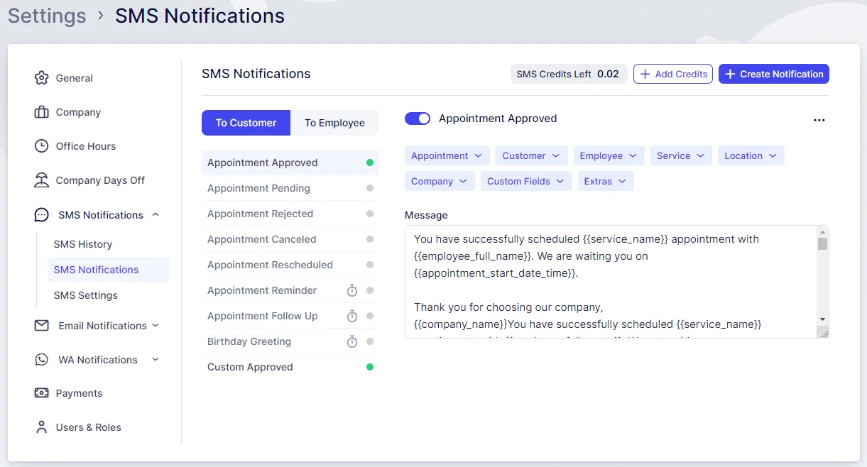 The SMS Notifications tab closely mirrors the Email Notifications tab, allowing you to customize various message types for both Customers and Employees. You can incorporate different placeholders to tailor your message content and determine the timing of your scheduled notifications.