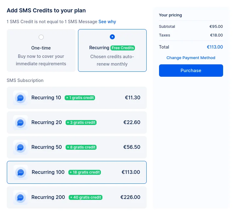 In the example above, we have selected 100 SMS credits per month. As a bonus, we will receive additional 18 SMS credits each month.