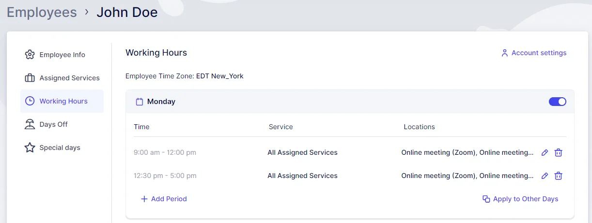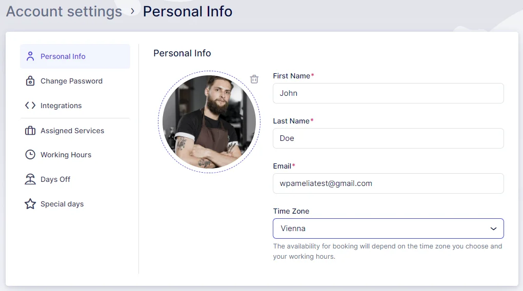 To set your schedule as an employee, log into the dashboard, go to Account Settings > Personal Info, and select your Time Zone. Then, navigate to Working Hours to define your availability. Appointments will display according to your time zone, working hours, days off, and special days. Customers can choose their time zone during booking, while administrators can set a default time zone for the admin dashboard to align appointments across different time zones (customer, employee, admin).