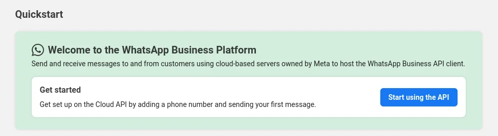 Depending on whether you already have a Business account or if you just created a new account and this is your first App, the next screen will either be the Quickstart or the Getting Started section. If you land on Quickstart, you’ll need to click on the “Start using the API” button: