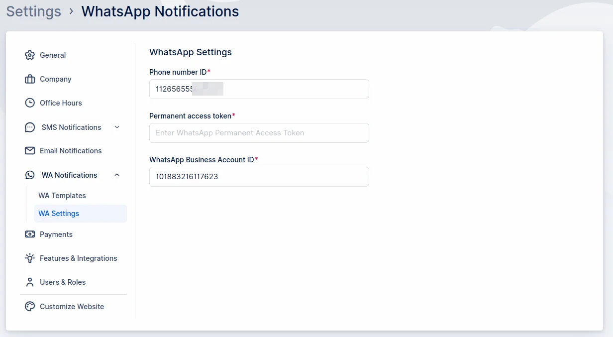 Now that you’ve configured the phone number for WhatsApp messaging, let’s proceed to copy this information into Quickly Booked App ’s settings. As mentioned earlier, you’ll need to return to the Phone Number ID and WhatsApp Business Account ID after adding your number.