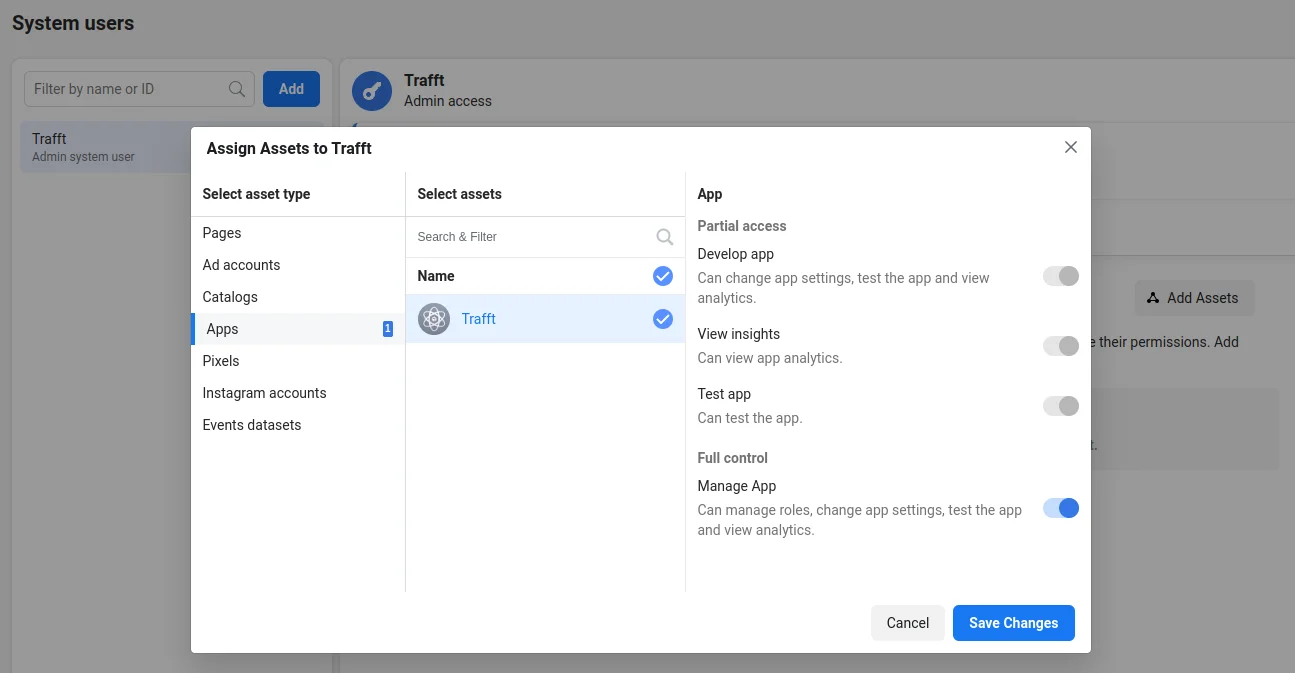 In the pop-up that appears, click on “Apps“, then select the app previously created for WhatsApp integration. Enable the Full Control (“Manage App”) slider, and click on “Save Changes”.