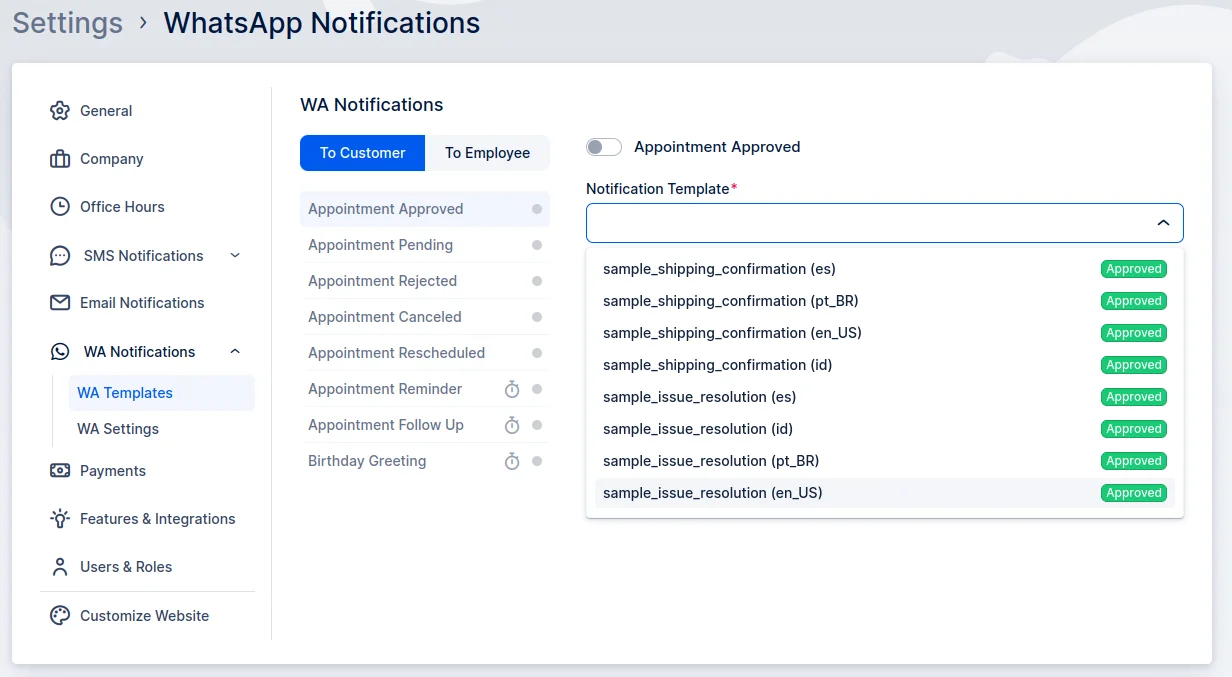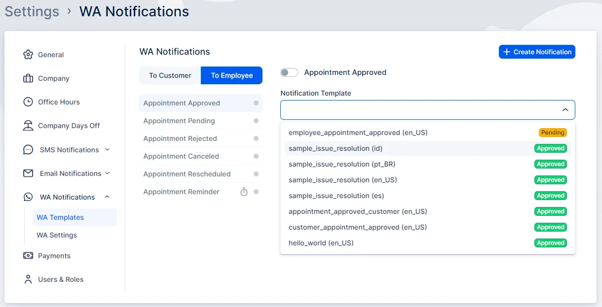 Back in Quickly Booked App’s Settings/WA Notifications/WA Templates (once you refresh the page), when you click on the “Notification template” drop-down, you will see the list of all templates created in the app (both approved and pending ones).