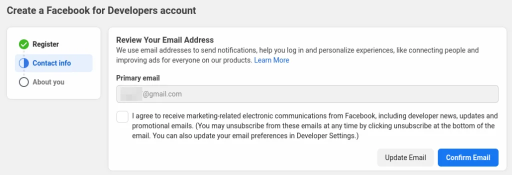 After verifying your account, ensure that the email linked to your Facebook account is valid. If you need to change it, click on “Update Email” in the lower right corner. If it’s the correct email address, click on “Confirm Email” to proceed to the final step.