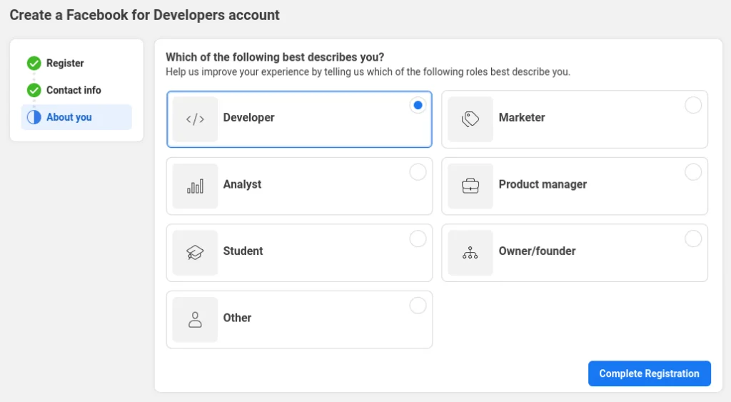 The last step is to help Facebook improve your experience with the Facebook for Developers account. You can select “Developer” as shown in the screenshot below, or choose another role that suits you. Once you’ve selected your role, click on “Complete Registration,” and you’re all set.