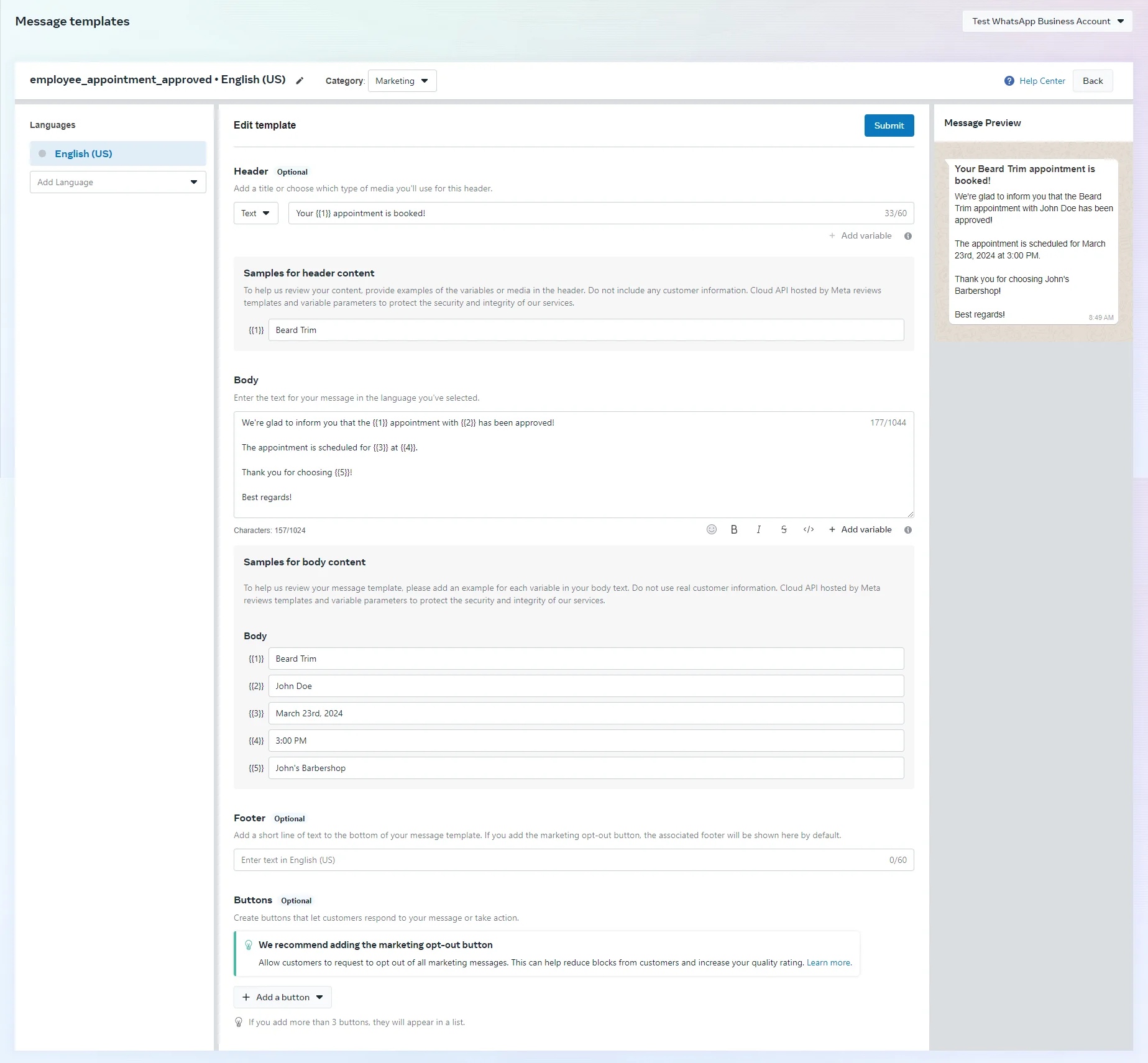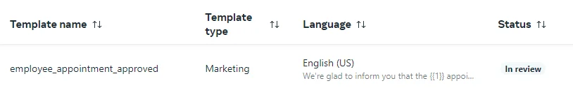 The primary distinction is the configuration of variables (placeholders) in the template, which can only be numerical. As illustrated in the screenshot below, these placeholders are formatted as {{1}}, {{2}}, and so forth, resembling Quickly Booked App’s placeholders enclosed in double curly brackets.