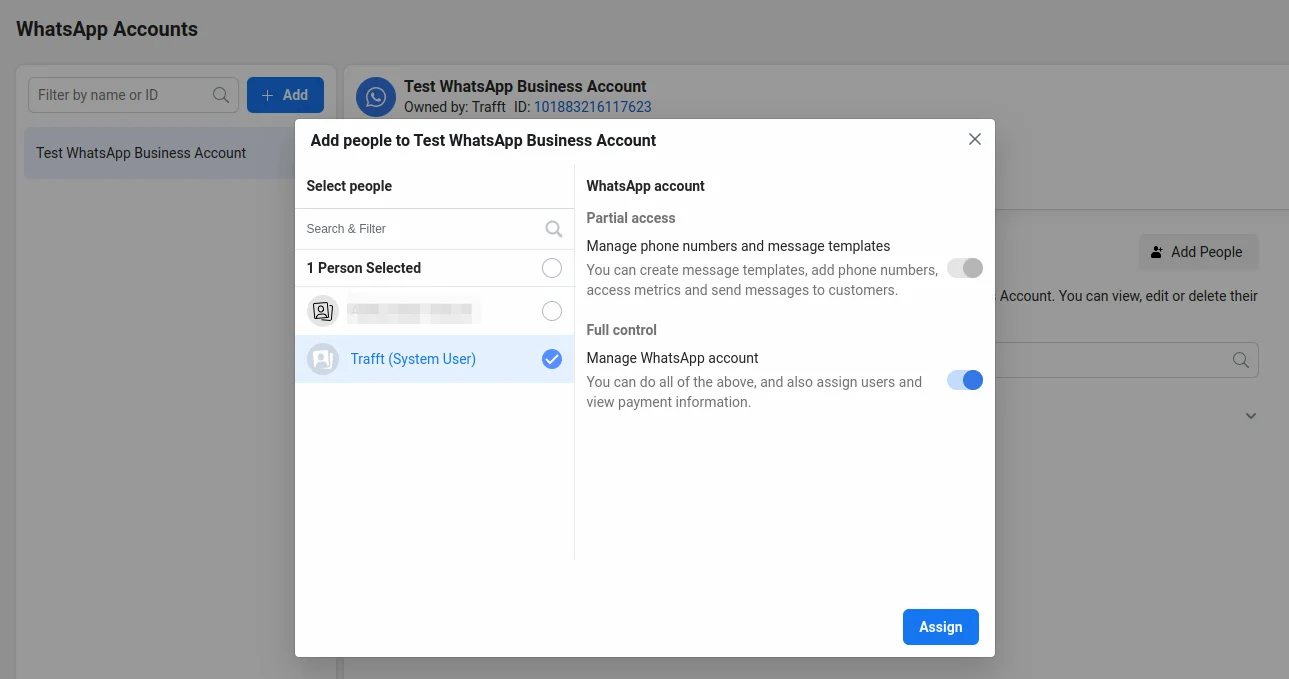 In the pop-up that appears, select the system user previously created, then enable the “Full Control” option, and click “Assign” in the bottom right corner.