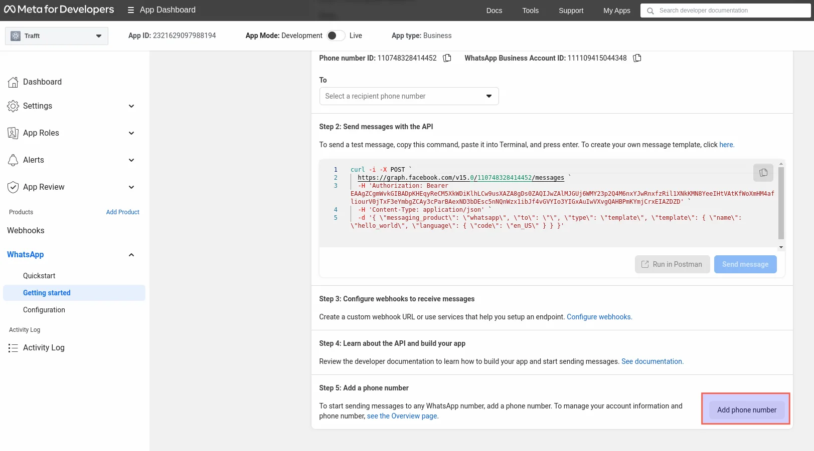 This will take you to the “Getting Started” section, which provides essential data for testing the app: a Temporary Access Token, Phone Number ID, WhatsApp Business Account ID, and the Curl command for sending messages.