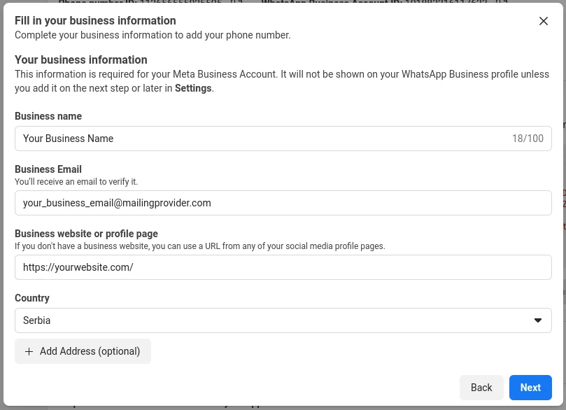 This will bring up a modal where you add your business name (this is the name your customers will see on WhatsApp when they receive a message from you), business email (needs to be a valid email, since you’ll need to confirm it), your country, and your business website.