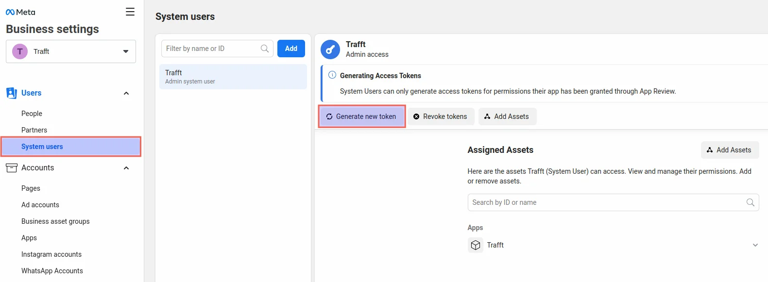 Next, return to the “System Users” section in the left sidebar (agree to Facebook’s Non-discrimination policy if prompted again), and click on the “Generate new token” button: