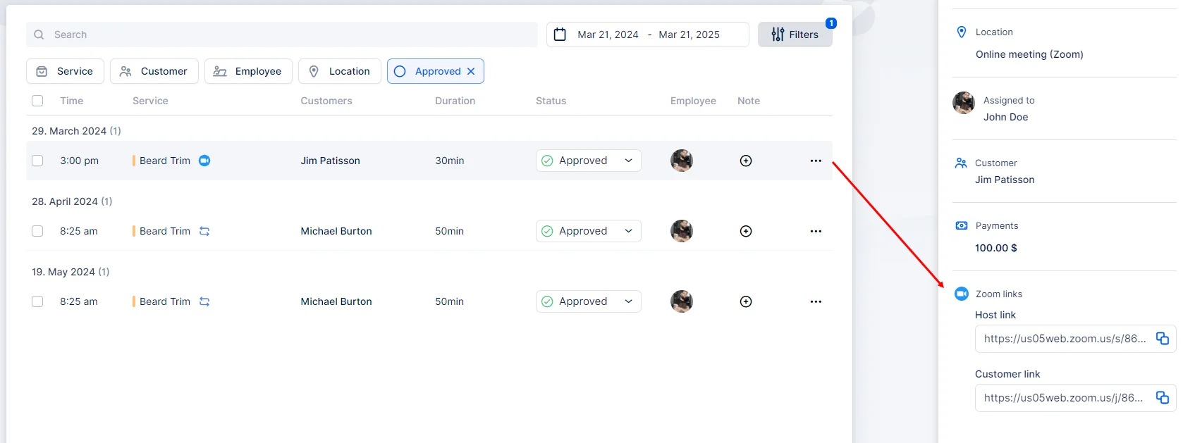 In addition to sending the Zoom link in notifications, you can also access it within the appointment details. On the Appointments page, you can easily distinguish between online and offline appointments by looking at the list. Online appointments will have a camera icon next to the service name. Simply click on the appointment with the camera icon, and in the appointment details, you’ll find both the Host and Join links readily available for easy access.