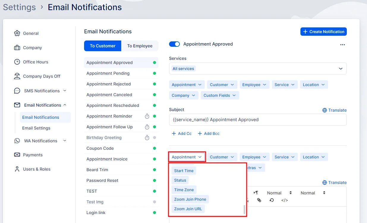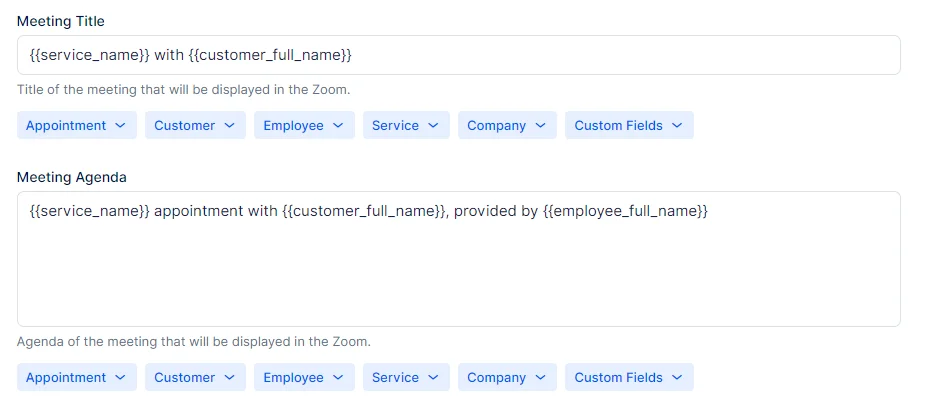 Once you’ve configured your Zoom settings, there is one final step if you want your customers and employees to receive links to the Zoom meetings through notifications. Navigate to Settings, then open Email Notifications. Within the Appointment placeholders (found in the Appointment dropdown), you will see options to include “Zoom Join URL” and “Zoom Join Phone” in both customer and employee notifications, while the “Zoom Host URL” (required by the employee to start the meeting) only in the employee notifications. After configuring these templates, click Save Settings to save your changes.