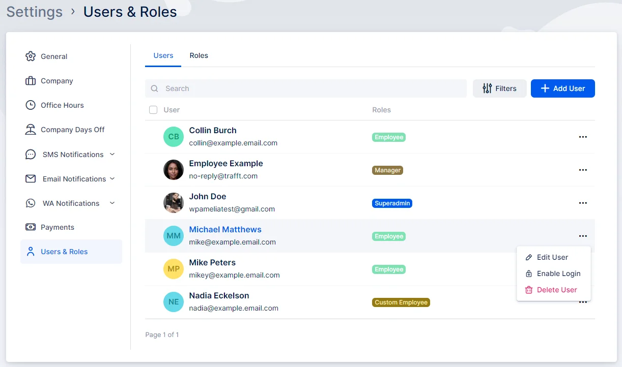 Once the employee’s account is created by the Admin or the Superadmin, their login needs to be enabled. This process is covered in detail in the Users and Roles documentation section, so we will provide a summary here.