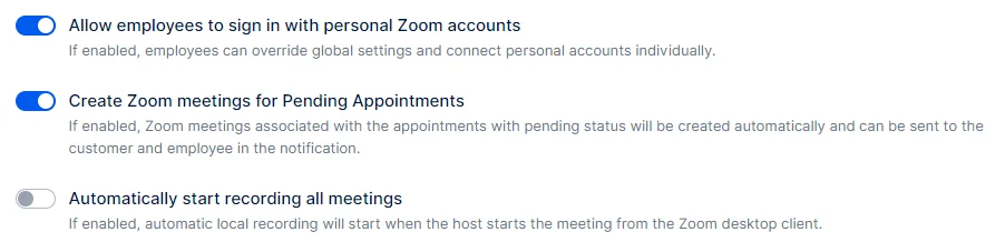 “Create Zoom meetings for Pending Appointments” – This setting allows you to decide if Zoom meetings should be created for appointments with a pending status. If disabled, Zoom meetings will only be created for appointments with an approved status.