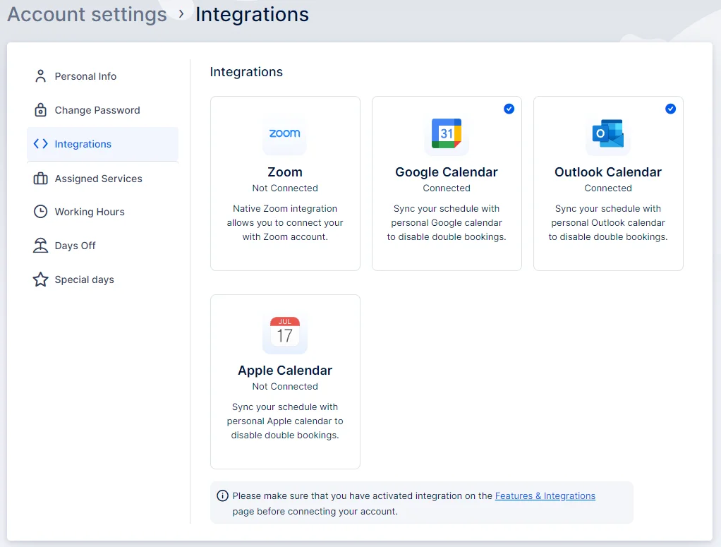 The Zoom integration for Quickly Booked App is considered a premium integration, and it will be counted towards your total number of Custom Features & Integrations.